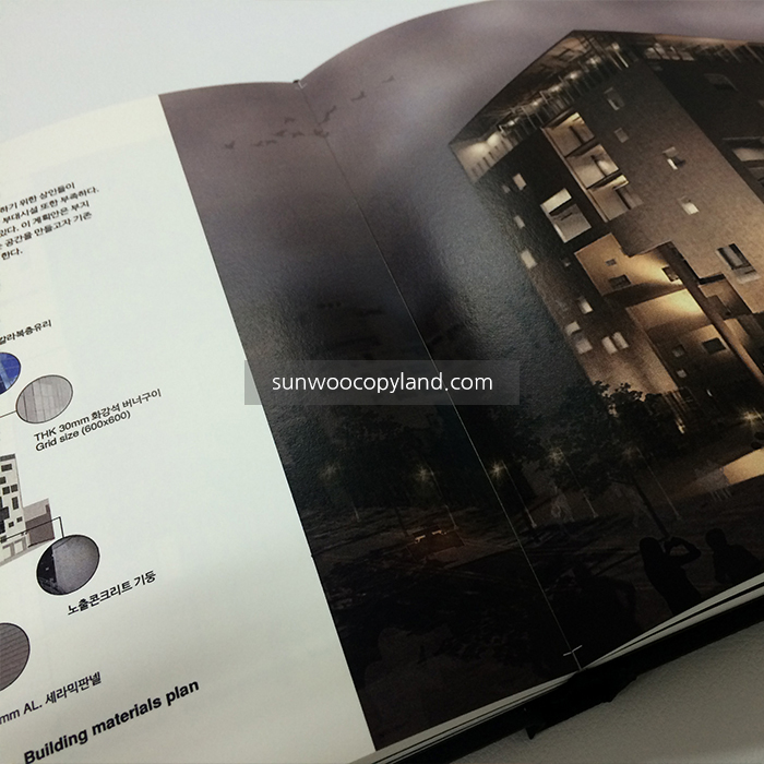 - 검정색 부띠끄 용지에 화이트 출력으로 건축라인을 표현하여, 심플하지만 유니크한 표지입니다.
